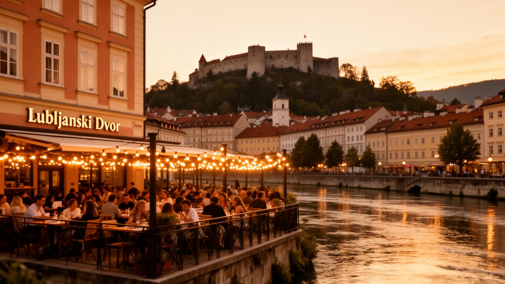 Lokacija je nepozabna — večerja ob reki s pogledom na grad.